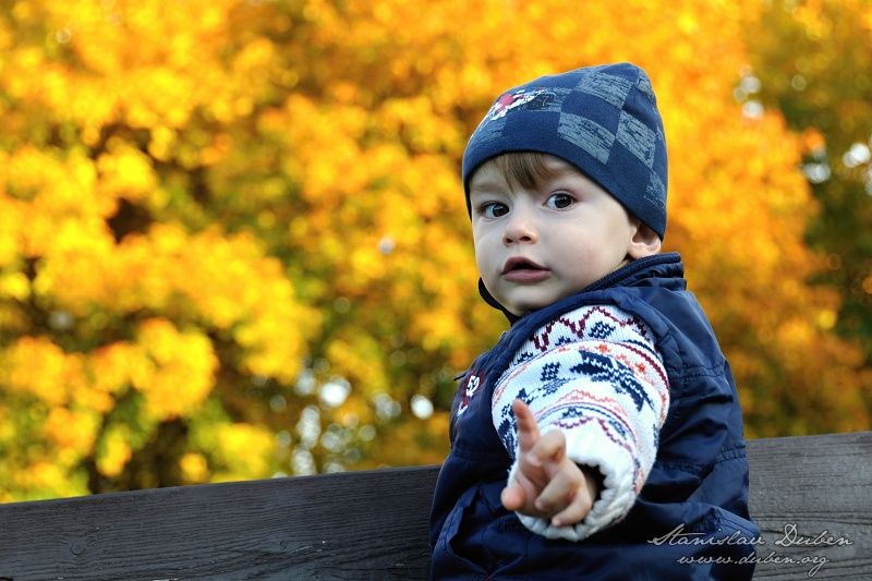 Procházek venku a focení jsem tak bohužel v tomhle týdnu se Staníkem moc nedal. Alespoň o víkendu když maminka odjela cvičit, jsme si zavolali na návštěvu tetu Anetku a vyrazili ven. Stromy plné barev, park plný sojek a Staník odmítající chodit venku, to byla sluncem zalitá nedělní idylka. Pokud nebyl v dohledu pes tak Staník sice nechtěl moc chodit, za psem naopak pádil a nešel zastavit, nicméně se rozhodl dělat "hají" pěkně na prostydlé zemi, většinou v místech kde bylo nejvíc bláta nebo mokro. Navíc už ho trošku začínají zajímat popadané kaštany a žaludy, takže příští rok bude podzim asi velice tvůrčí. Letos je to s těmi podzimními plody spíš takové sportovní. Tedy hlavně pro rodiče, tu máš kaštánek Staníku. Bác ho na zem. Eheh .. co? Chceš ho podat? No prosím. Bác ho na zem ... a tak dokola. Zkrátka taková procházková podzimní rozcvička.
